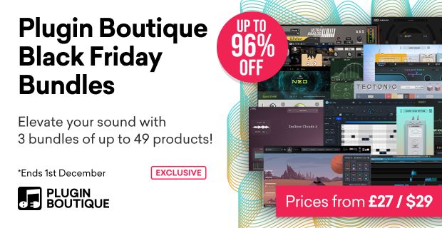 Music production plugins, recording plugins, audio plugins, Black Friday deals, sales, holiday sales, holiday shopping, music, audio, software, discounts, bundles, 95% off, 96% off, 25% off, 87% off, free music plugins, Plugin Boutique, FabFilter, iZotope, Waves, Sonible, effects, instruments, DAW, Logic, ProTools, Ableton, Reaper, Engineer, Producer, music producer, LoopCloud, 4 million sounds, 12 months for the price of 6, 10 free plugins, yours forever, elevate your sound with 3 bundles of up to 49 products!, industry leading effects, creative tools, and instruments, Ozone 11, RX 11, Elements & Creative FX, Black Friday Cyber Season sale, Discover premium industry standard audio processing